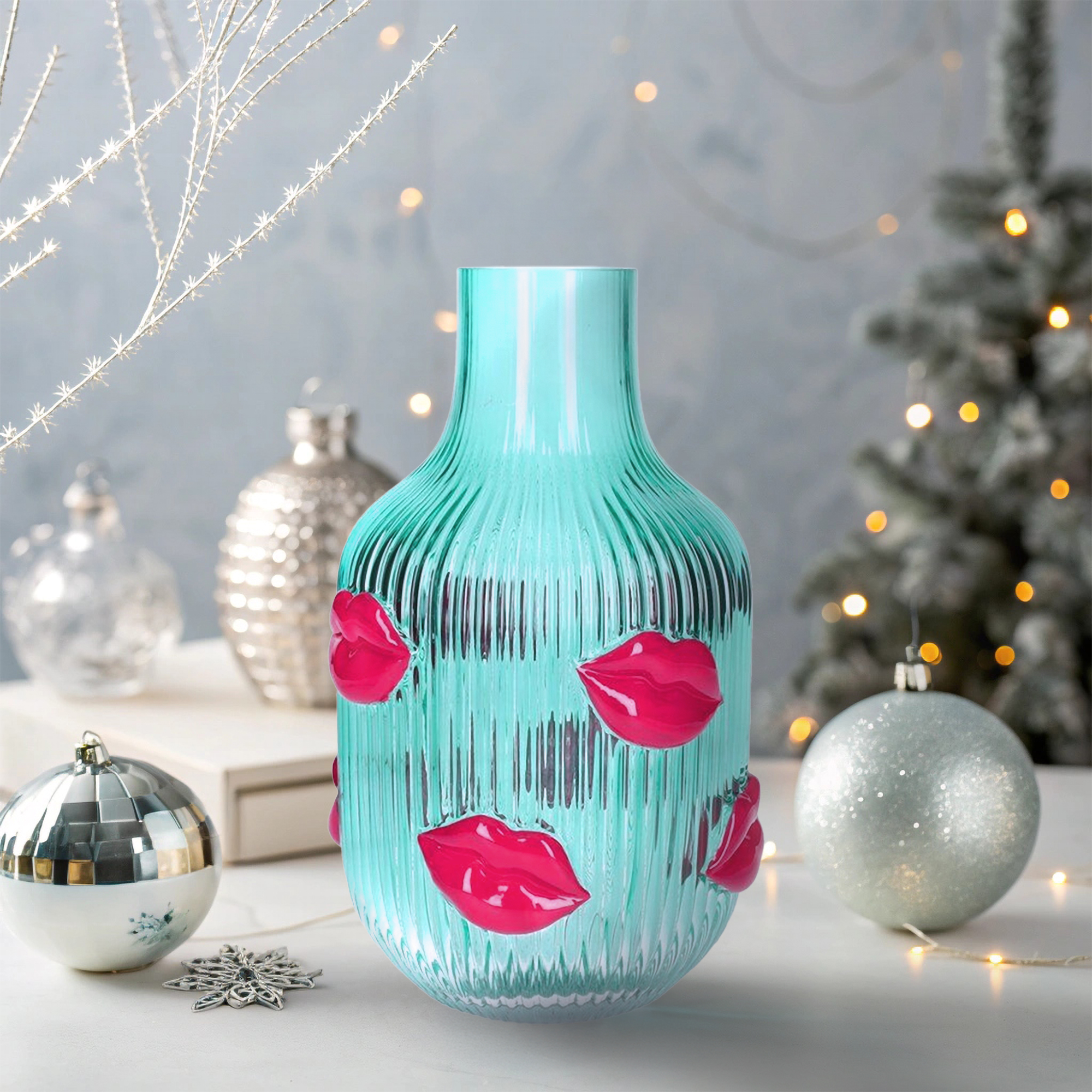 Une explosion de tendresse et de fraîcheur, pour un intérieur qui pétille ! Avec sa teinte bleue turquoise transparente, ce Vase Kisses capte la lumière de manière spectaculaire. Il crée une ambiance lumineuse et rafraîchissante. Orné de bouches en relief stylisées en forme de bisous rose, il apporte une dimension romantique et audacieuse à votre intérieur. Que vous l’utilisiez pour sublimer une table, un buffet ou simplement comme objet décoratif dans un coin de votre salon, cette décoration ajoute instantanément de la gaieté et du caractère à votre espace.